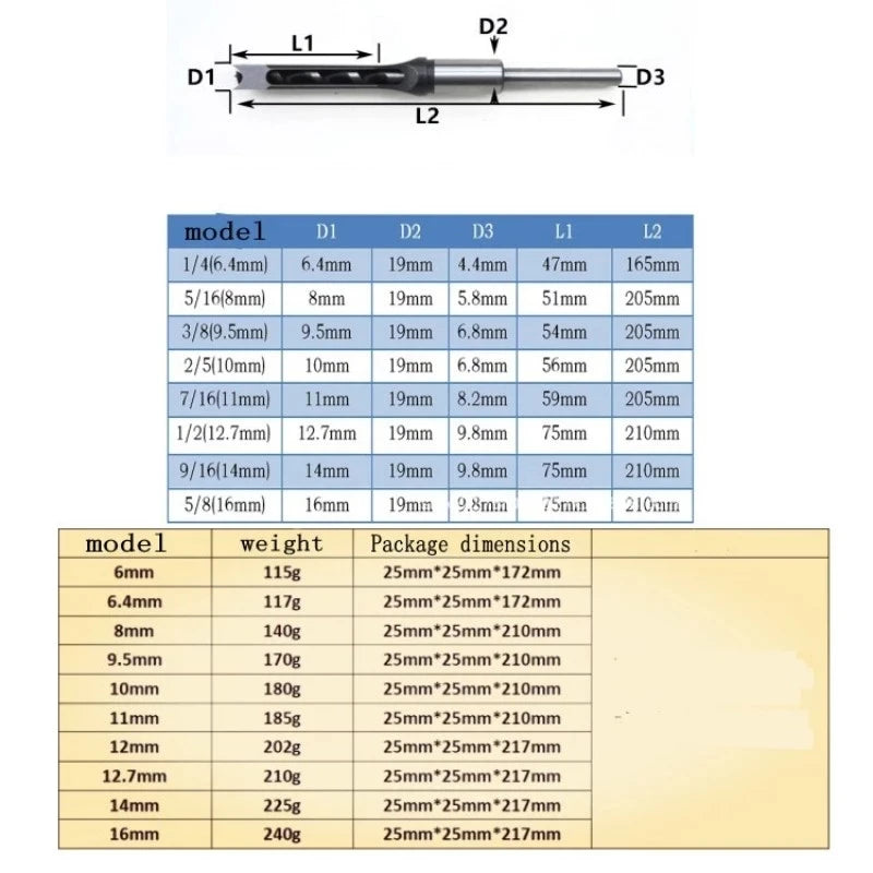 The Square Hole Drill Bit Set is designed for accurate square hole drilling in woodworking applications, such as mortise joints and structural connections. It combines a drill bit and outer chisel to create clean and precise square holes.